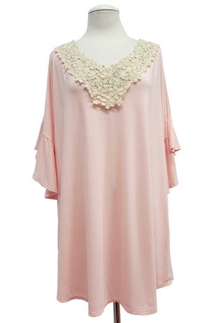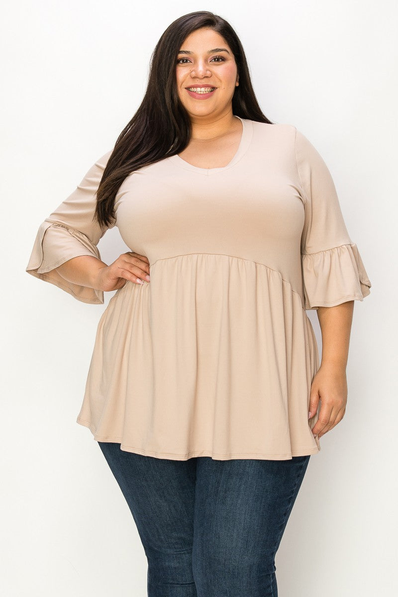 Light Taupe Beige V Neck Ruffle Slv Tunic Shirt Top