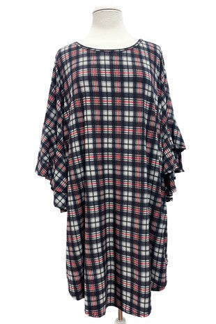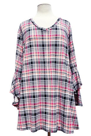 Pink Black Peach Plaid Shirt Top w Cascading Sleeves