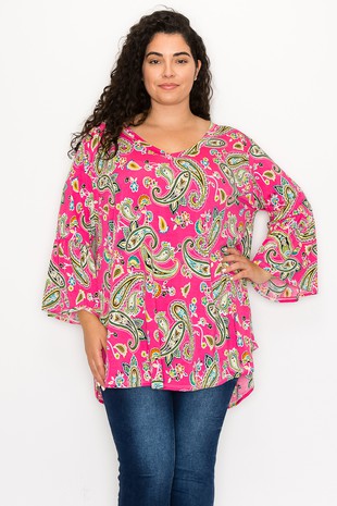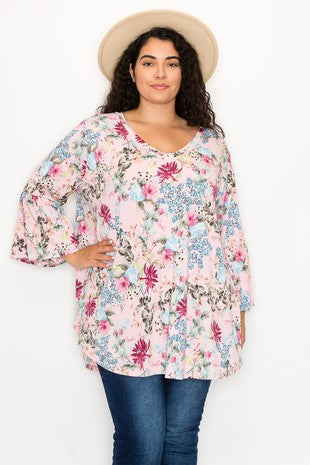 Pink Floral V Neck Floral Shirt Top w Bell Sleeves