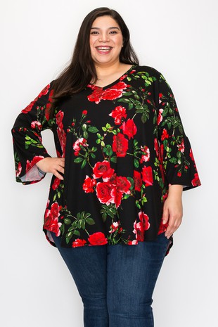 Black & Red Gorgeous Flower Print Shirt Top w Ruffle Sleeves