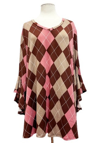 Pink Brown Beige Argyle Diamond Print Shirt Top