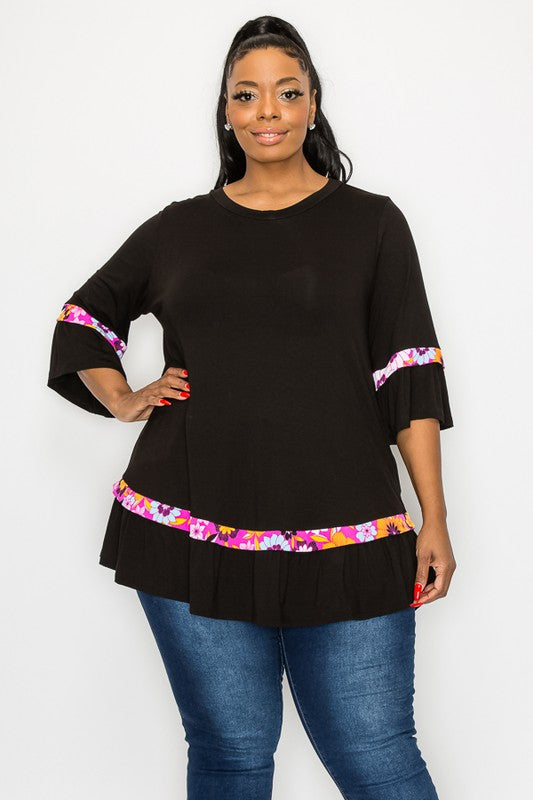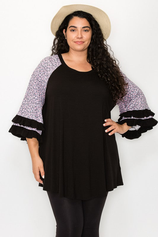 PSFU Black Shirt Top w Gray Pink Floral Sleeves
