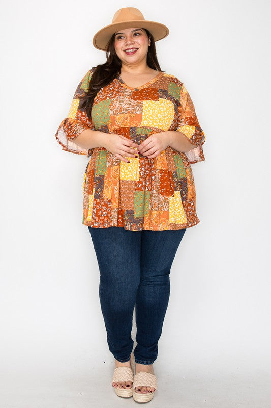 Brown Blue Swirl Wave Top w Wide Sleeves