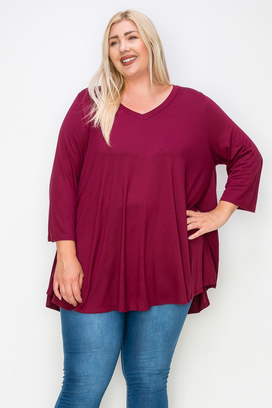 Solid Dark Burgundy Shirt Top, 3Qtr Sleeves V Neck