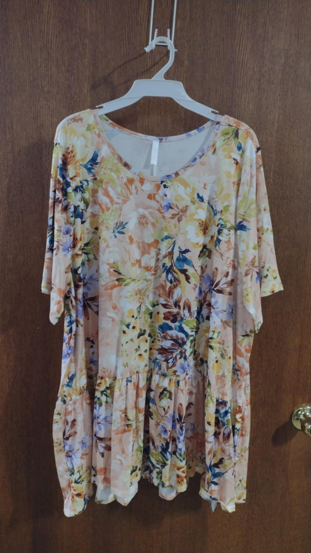 Peach Yellow Floral Shirt Top w Ruffle Hem
