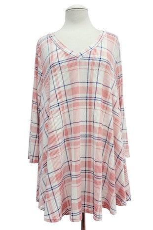Pink Peach Blue Plaid Shirt Top Tunic V Neck