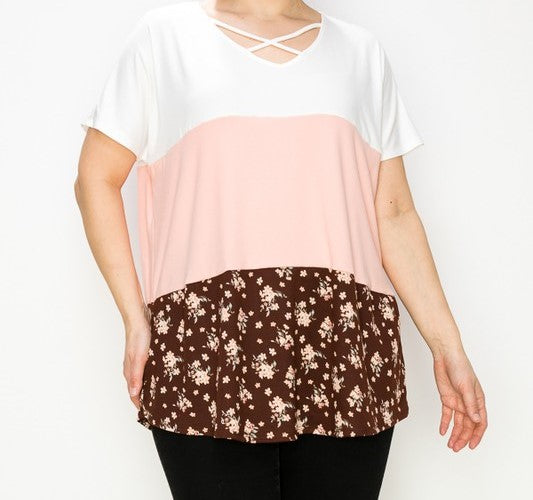 PSFU Color Block Top with X Criss Cross Neckline White Pink Brown Floral Shirt