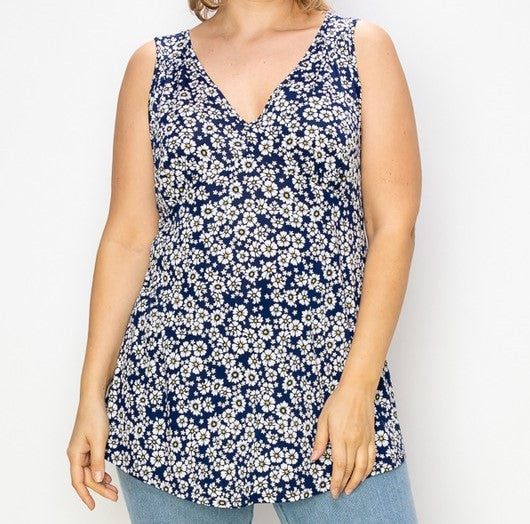 PSFU Blue Floral Print V Neck Tank Top w Tie Back