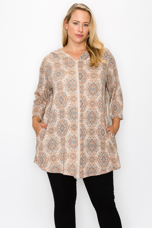 PSFU Beige Taupe Medallion Print Zip Up Hoodie Hoody