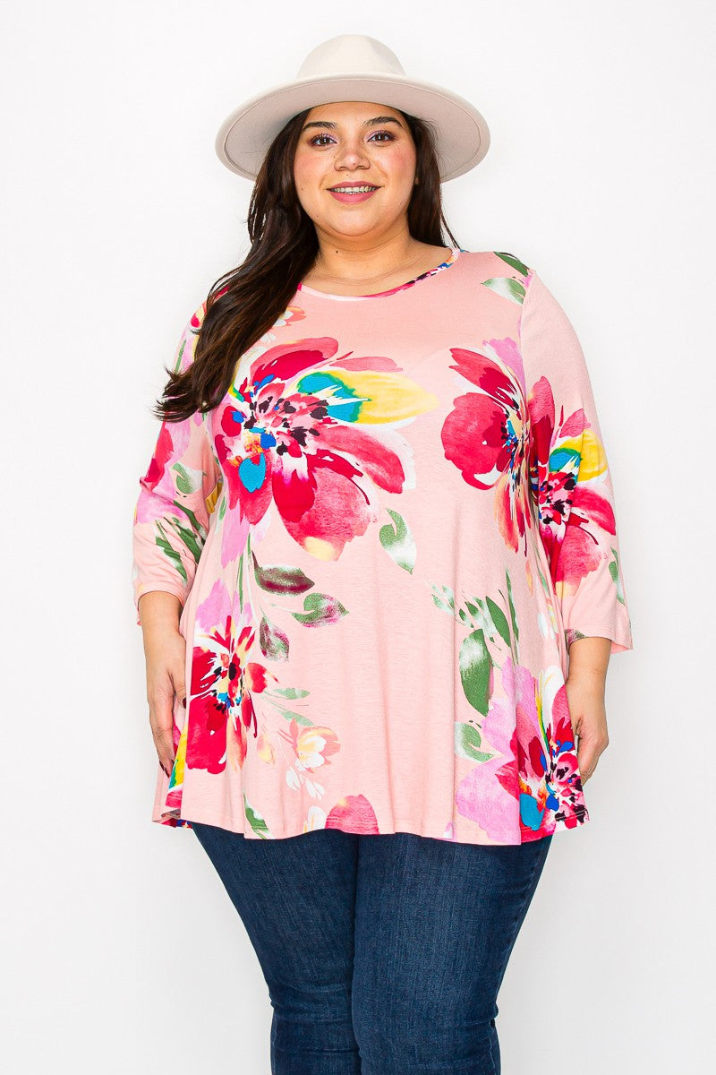 Big Pink Floral Print 3Qtr Sleeves Shirt Top