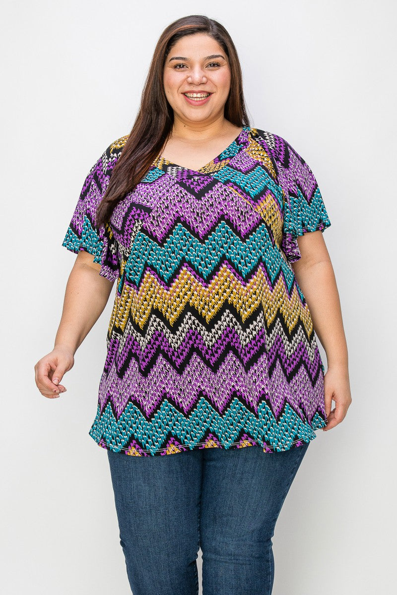 Brown Blue Swirl Wave Top w Wide Sleeves
