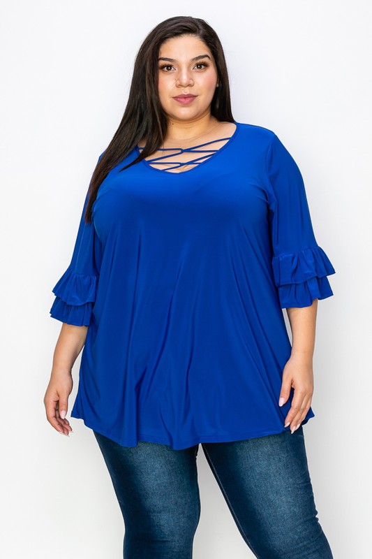PSFU Blue Caged Neck X Neck Shirt Top w Ruffle Sleeve