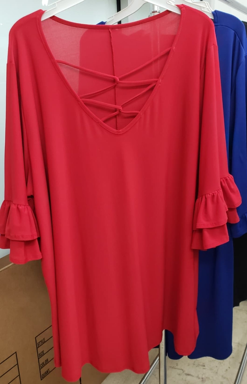 PSFU Red Caged X Neck Shirt Top w Ruffle Sleeve