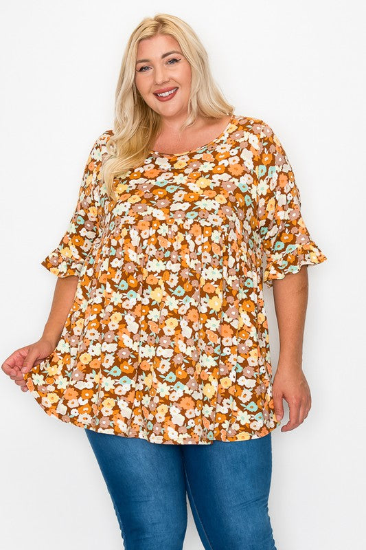 PSFU Brown Orange Fall Floral Print Baby Doll Top