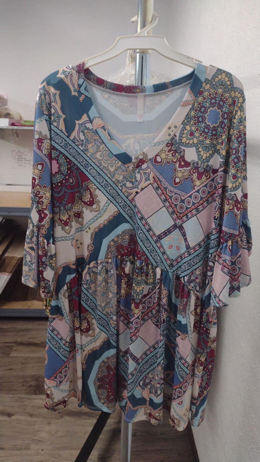 Blue Mauve Pink Medallion Shirt Top V Neck